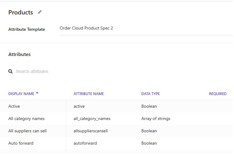 - Create an entity I named it “Products”. Use attribute template “Order Cloud Product Spec 2” as a base template. It holds all the attributes mapped to the OrderCloud product data model.